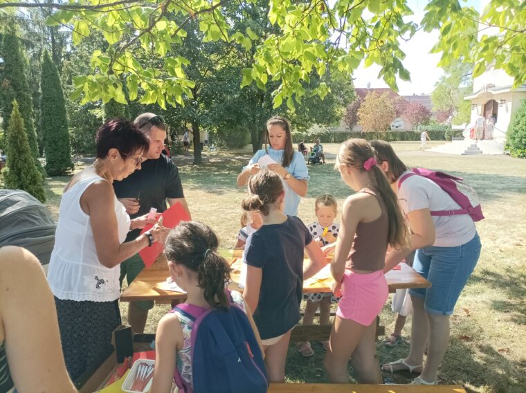 a „Szent Lajos akadályverseny” keretében a gyerekeknek állomásokon keresztül vonulva kellett feladatokat megoldani. Az első helyszín az oltár előtt várta őket, bent a templomban, a többi pedig kint az udvaron: fejtörők, rejtvények, kézműves feladatok sora várt rájuk, hogy a végén jöjjön a „meglepetés”.