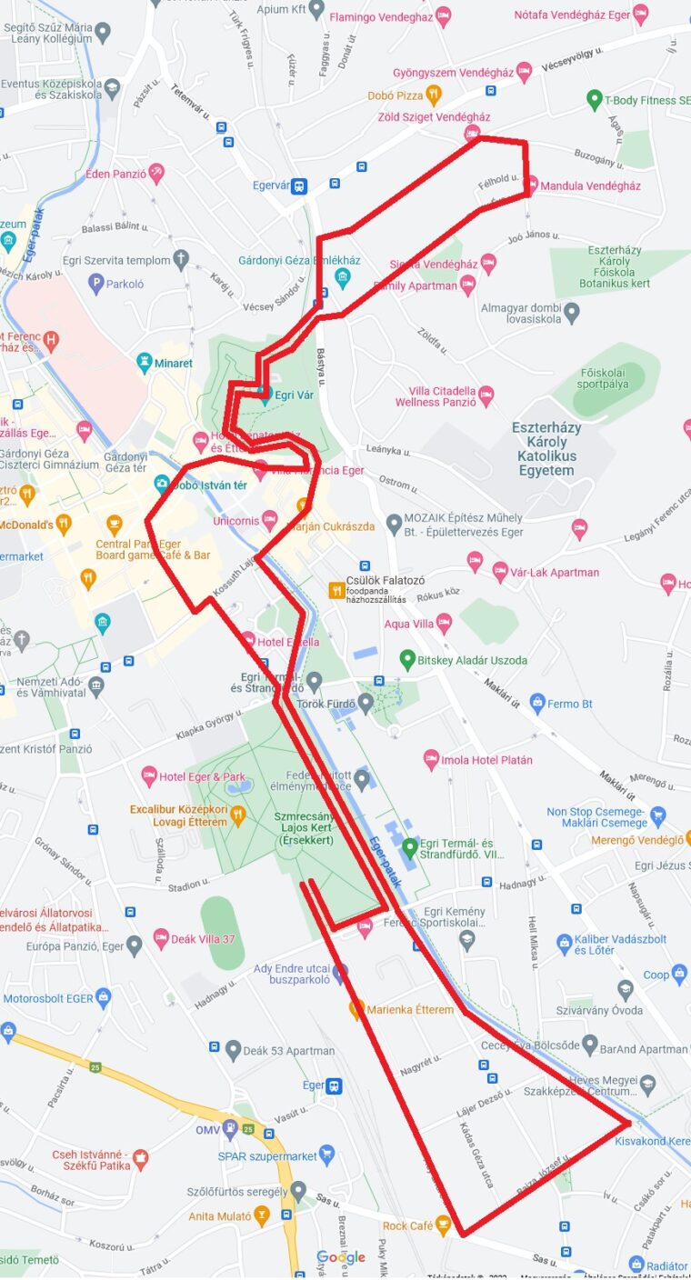 - Érsekkert – Ady E. u. – Bajza József u. – Homok u. – Maklári út – Diófakút út – Legányi Ferenc u. – Leányka u. – Gárdonyi G. u. – Bástya u. – EGRI VÁR – Dobó u. – Dobó tér – Bajcsy Zs. u. – Jókai utca – Kossuth L. út – Egészségház út – Táncsics sétány – Érsekkert.