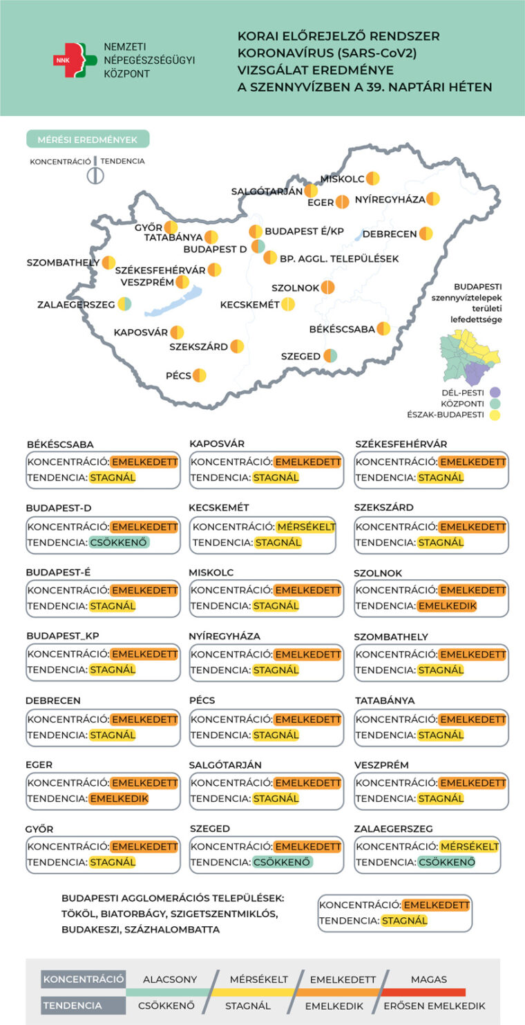 Azt írták, a 39. héten is folytatódott a szennyvízben mért koronavírus-örökítőanyag koncentrációjának csökkenése.