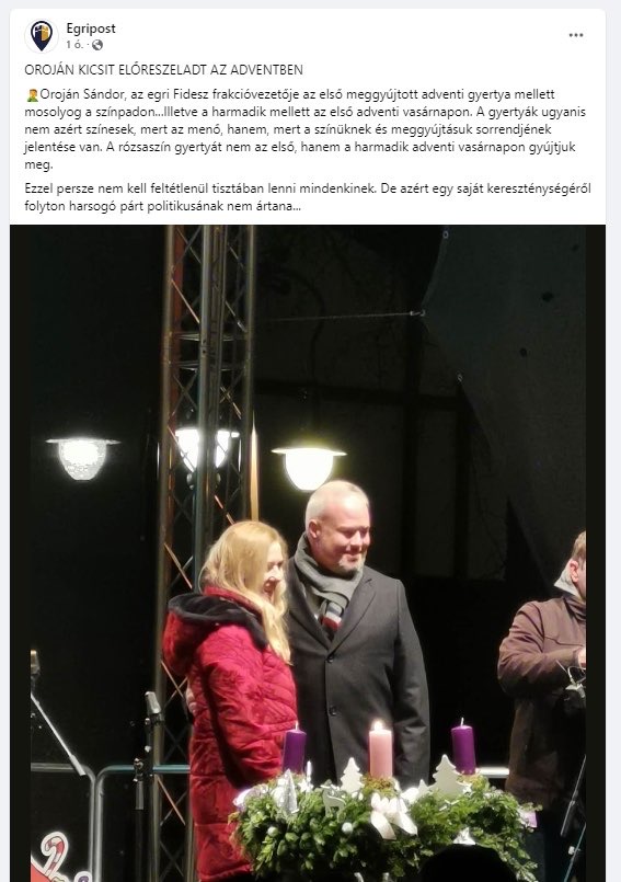 Vasárnap dr. Pajtókné dr. Tari Ilona meggyújtotta a Dobó téren felállított adventi koszorún az első gyertyát. A színpadon a koszorú mögött többek között felsorakoztak a fertálymesterek és az Egri Borbarát Hölgyek Egyesületének képviselői mellett önkormányzati képviselők és Várnagy Andrea, egri zongoraművész is. A gyertyagyújtást követően Oroján Sándor, a Fidesz frakcióvezetője beállt egy közös kép erejéig a koszorúhoz Várnagy Andreával. Ezt a pillanatot sikerült az Egripost íróinak lencsevégre kapniuk, majd a csalóka fotóból kiindulva egy nem túl barátságos hangvételű posztot kanyarítaniuk.
