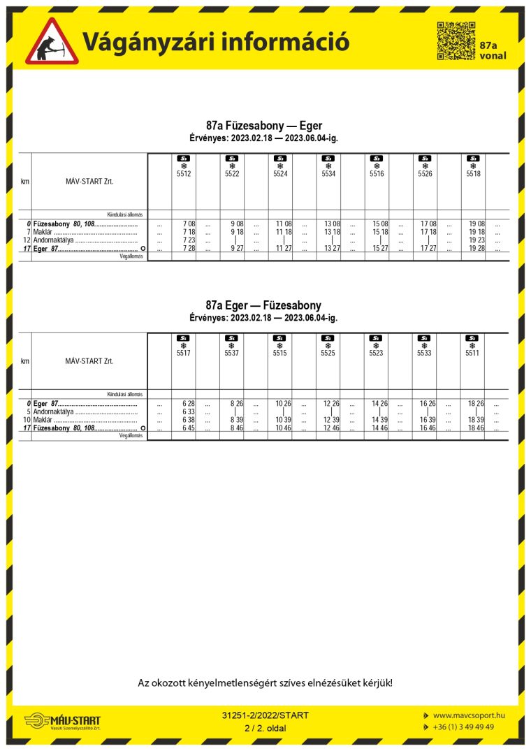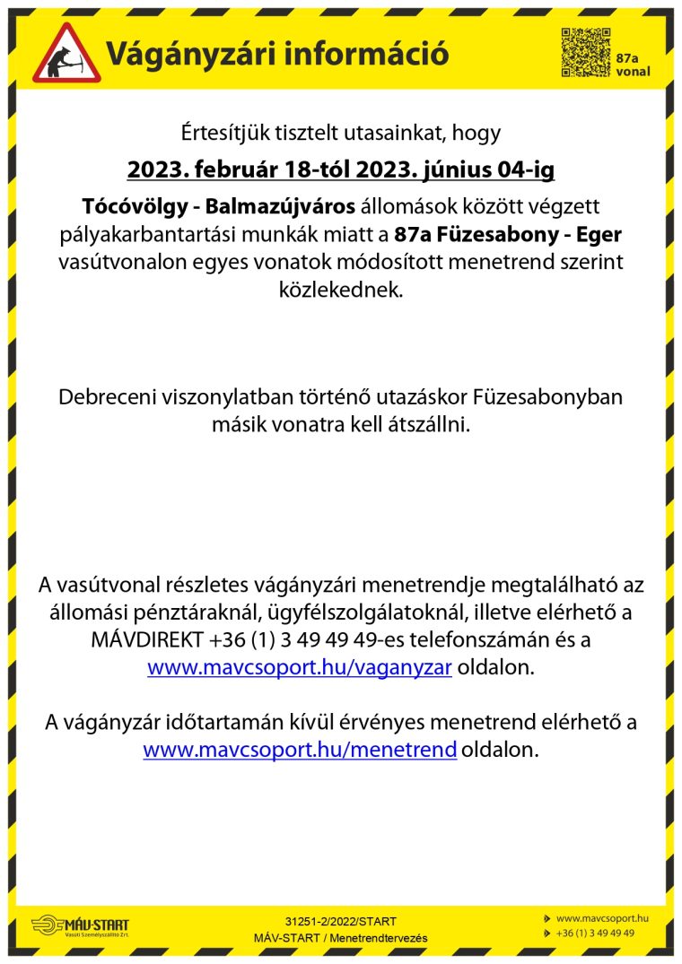 A MÁV-START Zrt. tájékoztatása alapján 2023. február 18-tól 2023. június 04-ig a Tócóvölgy – Balmazújváros állomások között végzett pályakarbantartási munkák miatt a 87a sz. Füzesabony – Eger vasútvonalon egyes vonatok módosított menetrend szerint közlekednek.