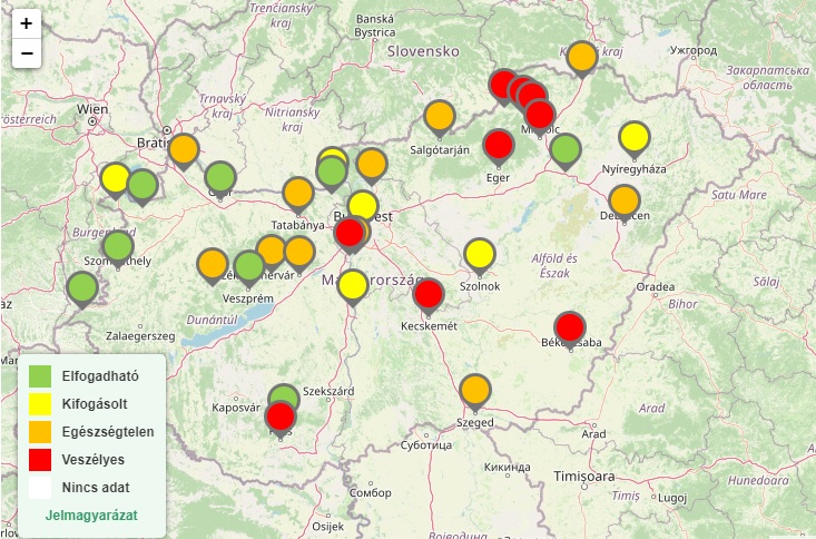 Hat település – Nyíregyháza, Szolnok, Dunaújváros, Budapest, Esztergom és Sopron – levegője kifogásolt minőségű a mérőállomások adatai szerint.