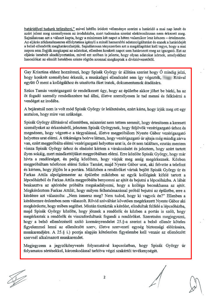 Tehát a cég szerint nem a kollégájuk volt az, aki agresszívan lépett fel az alpolgármesterrel szemben. Hozzáteszik azt is, korábban rendszeresen előfordult, hogy a Spisák György aljegyző és a belső vizsgálatot vezetői hivatali kolléga által kikért és megkapott adatok szinte azonnal kikerültek a sajtóba, ezért öt tanú jelenlétében – akik a jegyzőkönyv aláírói voltak – Gay Krisztina megkérte Spisák Györgyöt, hogy nyilatkozzon arról, hogy az ott elhangzott információkkal, illetve a jegyzőkönyvben foglaltakkal kapcsolatban titoktartási kötelezettségének eleget tesz-e.