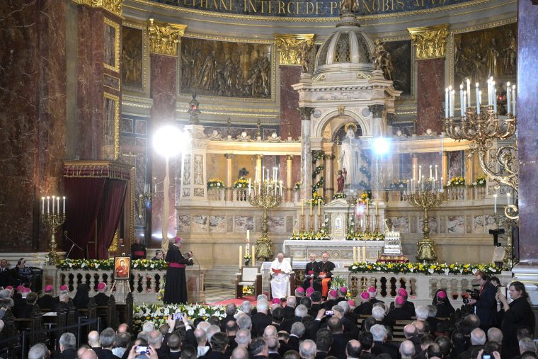 Az ateista üldözés alatt mártírhalált halt püspökök, papok, szerzetesek és szerzetesnők tanúsítják a magyarság sziklaszilárd hitét – mondta Ferenc pápa a budapesti Szent István-bazilikában péntek este, ahol a Magyar Katolikus Egyház képviselőivel találkozott.