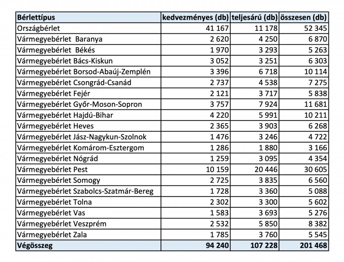A vármegyebérletek kétharmada teljesárú, az országbérleteknél azonban fordított az arány: ott a 90%-os kedvezménnyel megvásárolható bérletekből fogyott több, majdnem négyszer annyi, mint a teljesárú díjtermékből. A vármegyékre bontott részletes eladási adatok a táblázatban láthatók.