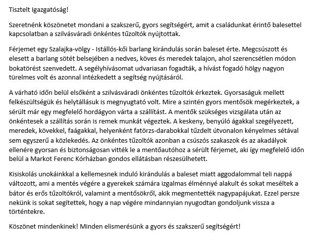A szerencsétlenül járt férfi felesége levélben kereste fel a Katasztrófavédelmet – adta hírül a BM Országos Katasztrófavédelmi Főigazgatóság a Facebook-oldalán. Az asszony hálával beszélt arról, hogy férje milyen gyors és szakszerű ellátást kapott a helyszínen, majd később aztán az egri kórházban is. Az ijedelem után a kisunokák is pozitívabb élményeket „raktároztak”. Alább az egész levél elolvasható: