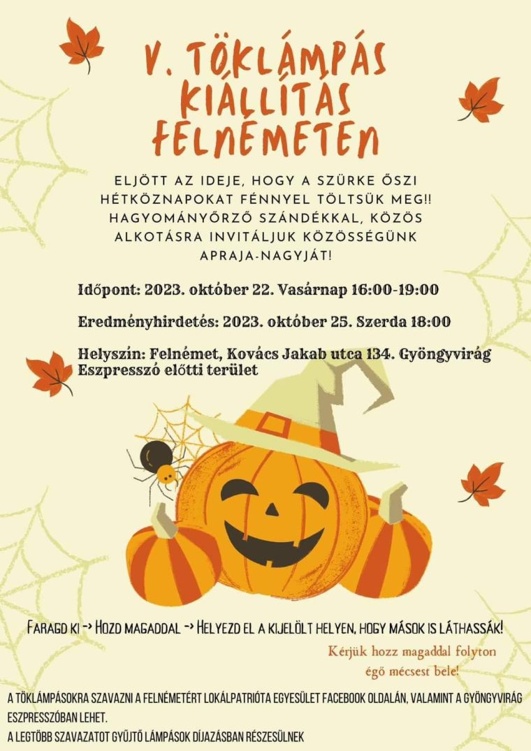 A töklámpásfaragó-versenyben idén október 22-én, vasárnap 16 és 19 óra között várják az elkészült műveket, a legjobbakat díjazni fogják.