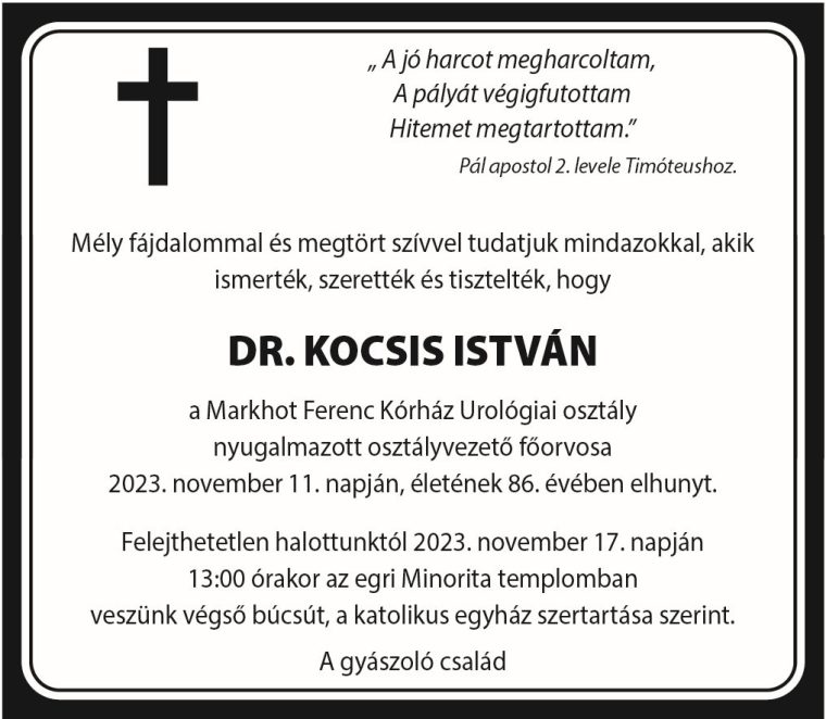 Életének 85. évében, Egerben elhunyt Dr. Kocsis István főorvos, a Markhot Ferenc Kórház Urológiai osztályának egykori osztályvezetője, az intézmény volt főigazgatója. Nevéhez fűződik az Urológiai osztály létrehozása, valamint számos, máig ható intézményi fejlesztés. Emlékét kegyelettel megőrzi az intézmény közössége – írja közleményében a kórház.