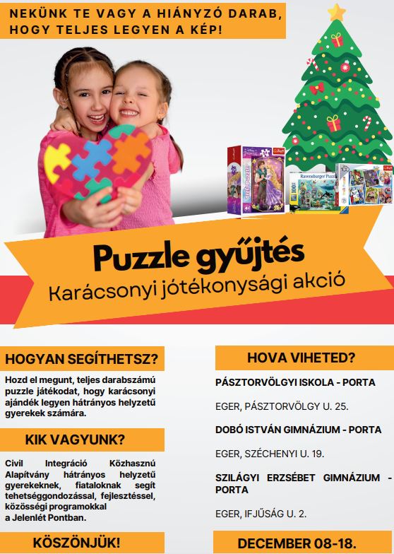 A puzzle fontos készségfejlesztő egy kicsi gyereknek. A hátrányos helyzetű picúrok egész biztos örülnek neki, ha kirakót kapnak karácsonyra. Az akció „lefedi” a várost: a Belvárosban, Felnémeten és a Lajosvárosban is gyűjtik az adományokat, szóval még fáradni sem kell nagyon a jócselekedetért.
