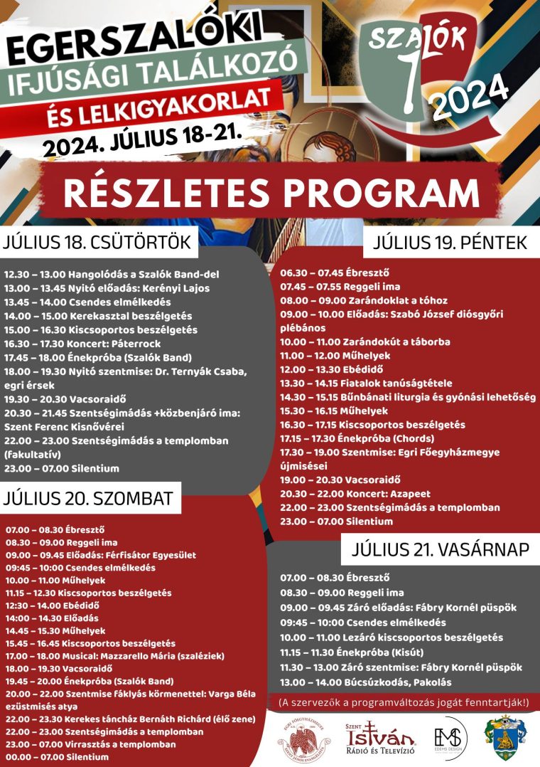 Július 18–21. között idén is Egerszalókra várják a 16–29 év közötti fiatalokat. A szervezők értékes programokkal – előadásokkal, műhelymunkával, kiscsoportos és kerekasztal-beszélgetésekkel, koncertekkel és más szabadidős tevékenységekkel – készülnek, illetve szentségimádásra és szentgyónásra is lesz lehetőség. A nyitó szentmisét július 18-án 18 órától Ternyák Csaba egri érsek mutatja be.