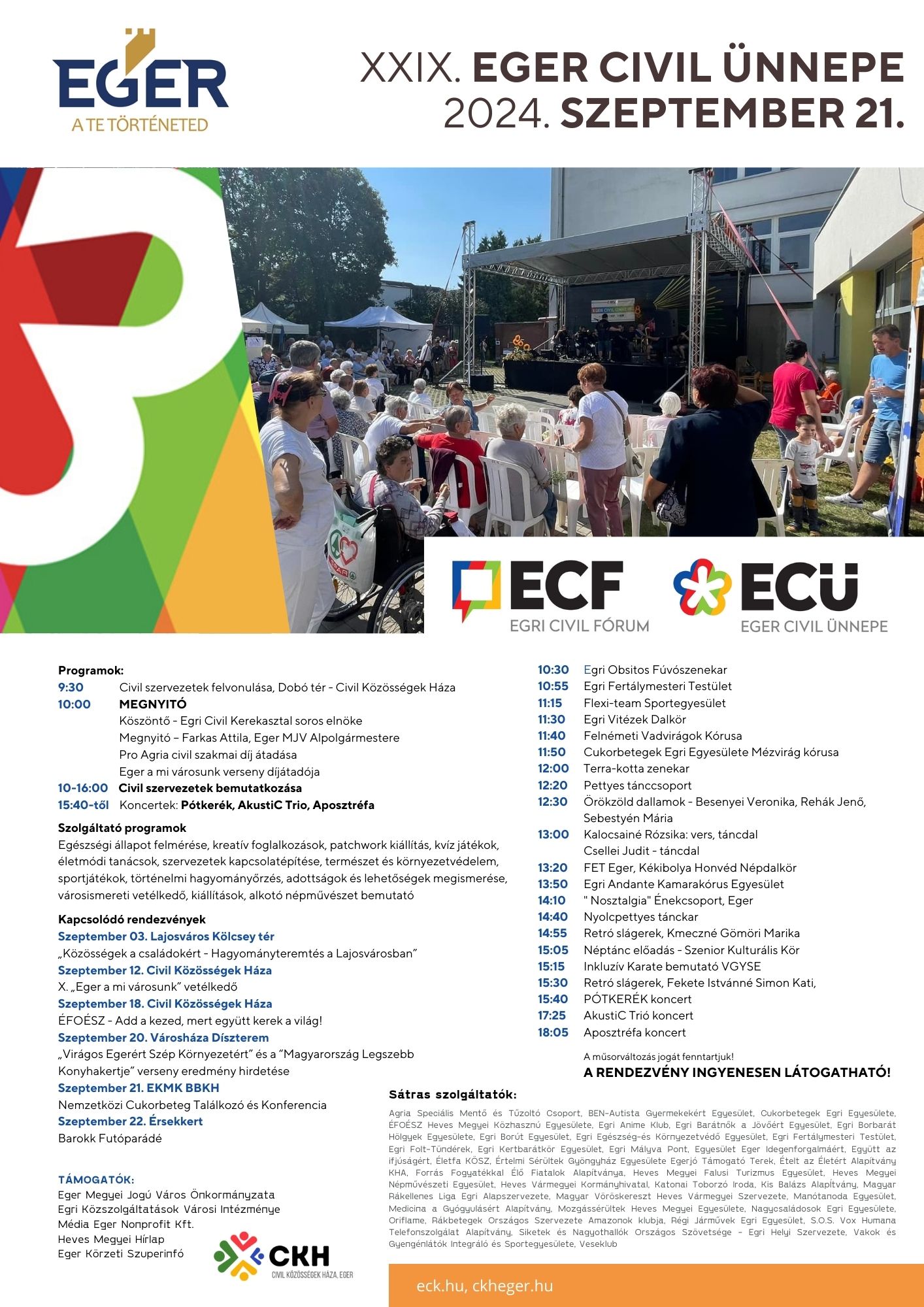 Rengeteg programmal készülnek a civilek. Többek közt szeptember 21-én 10-16 óra között 39 sátras szolgáltató települ ki a CKH és a szomszédos Szent Imre Kat. Ált. Isk. udvarára, a civil szervezeteken túl a Heves Vármegyei Kormányhivatal, a Katonai Toborzó Iroda is.