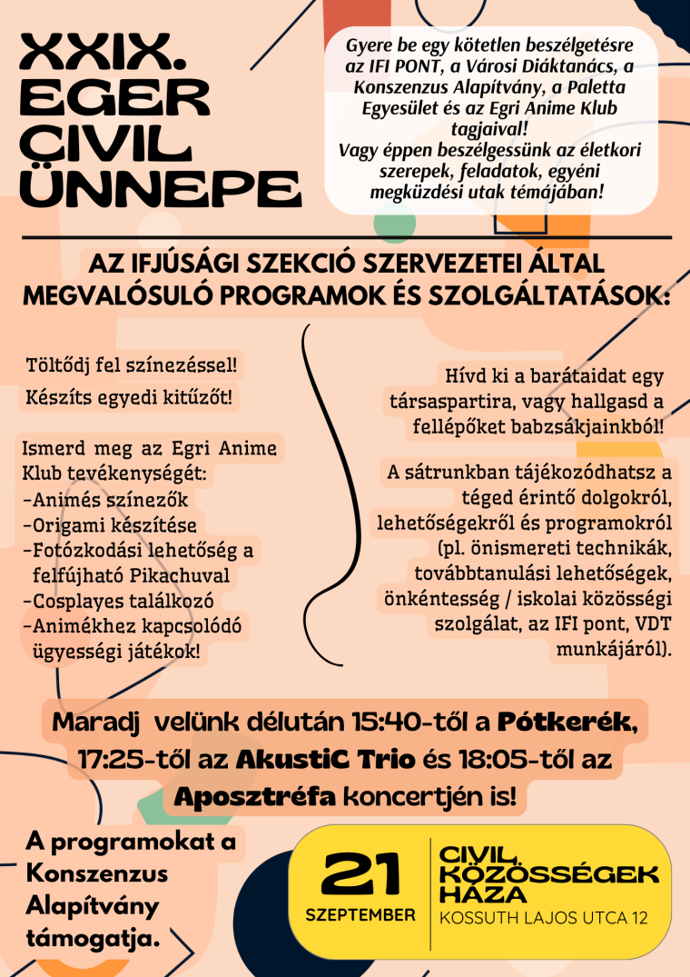 Idén 29. alkalommal rendezi meg az Egri Civil Fórum és Kerekasztal az egri civilek ünnepét. A rendezvényen több mint 60 civil szervezet és közösség jelenik meg színpadi előadás vagy sátras szolgáltatás formájában, és átadják a pro Agria Civil Szakmai Díjat is.