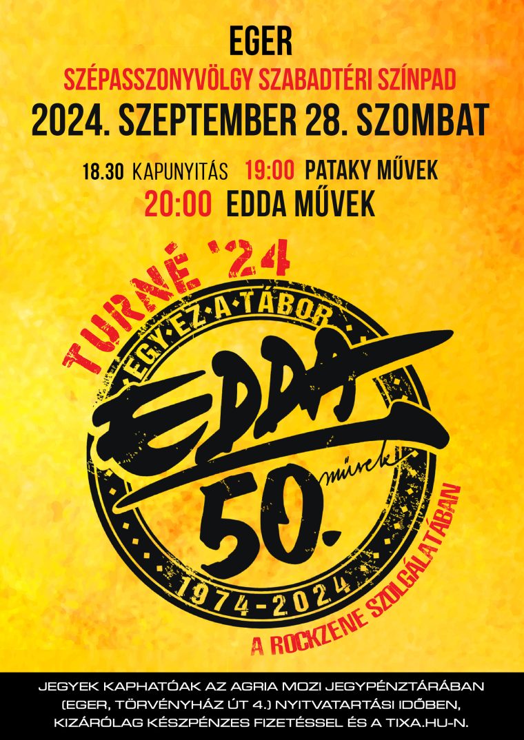Jegyek kaphatóak a https://tixa.hu/edda-muvek-50-eger-20240928 vagy az Agria Mozi jegypénztárában, nyitvatartási időben, kizárólag készpénzes fizetéssel, illetve korlátozott számban kapunyitás után a helyszínen.
