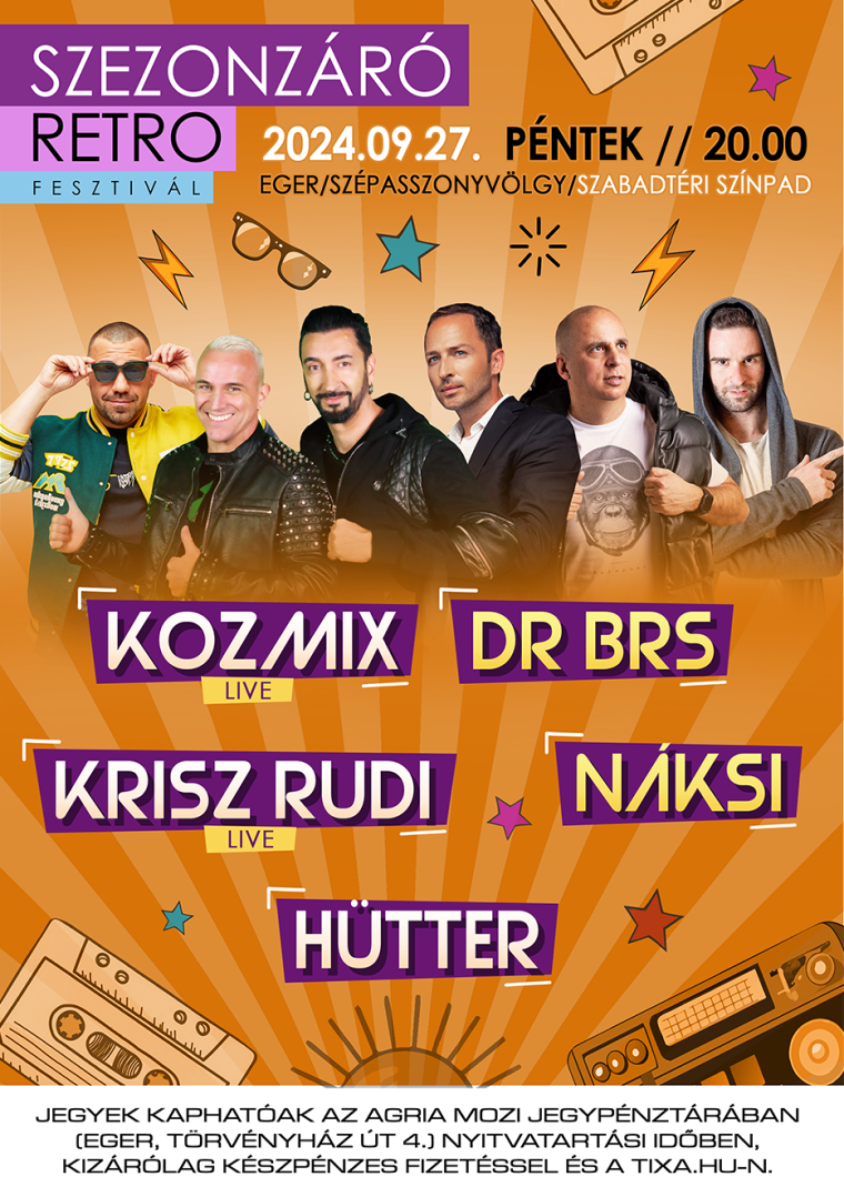 a Szezonzáró Retro Fesztivál 20:00 órakor nyitja meg kapuit! 21:00 órától a legszerelmesebb dalok előadója Krisz Rudi lép színpadra, 22:30-tól a magyar hardcore, trance és dance nagykövetei, a Kozmix pörgeti fel a bulit, akiket az ország egyik legismertebb lemezlovasa, Náksi Attila követ éjféltől. A DJ pultot 1 órától a zenéivel gyógyító DR BRS veszi át, aki olyan nagy előadókkal készített közös slágereket, mint Varga Viktor, Zalatnay Cini, Kollányi Zsuzsi vagy a Fekete Vonat és a Halott Pénz.