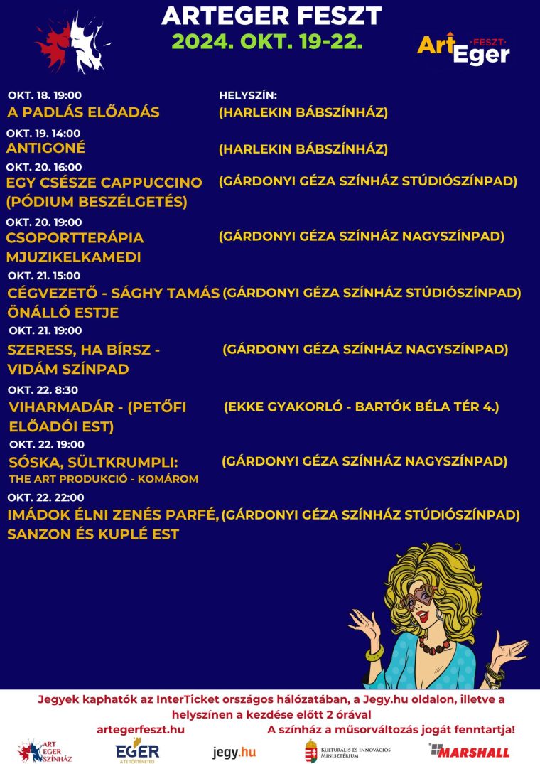 Kibéreltük az egri Gárdonyi Géza Színházat, emellett a Harlekinben és az egyetem gyakorlóiskolájának Bartók téri rendezvényközpontjában is lesznek programjaink.