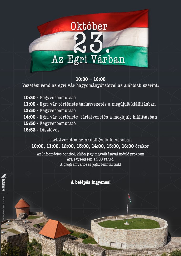 Október 23-án a Dobó István Vármúzeumban is ünnepelhet, a kiállításai az Egri várban, valamint a Gárdonyi Géza Emlékmúzeum, a Lenkey-ház és a Ziffer Sándor Galéria is ingyenesen látogathatóak.