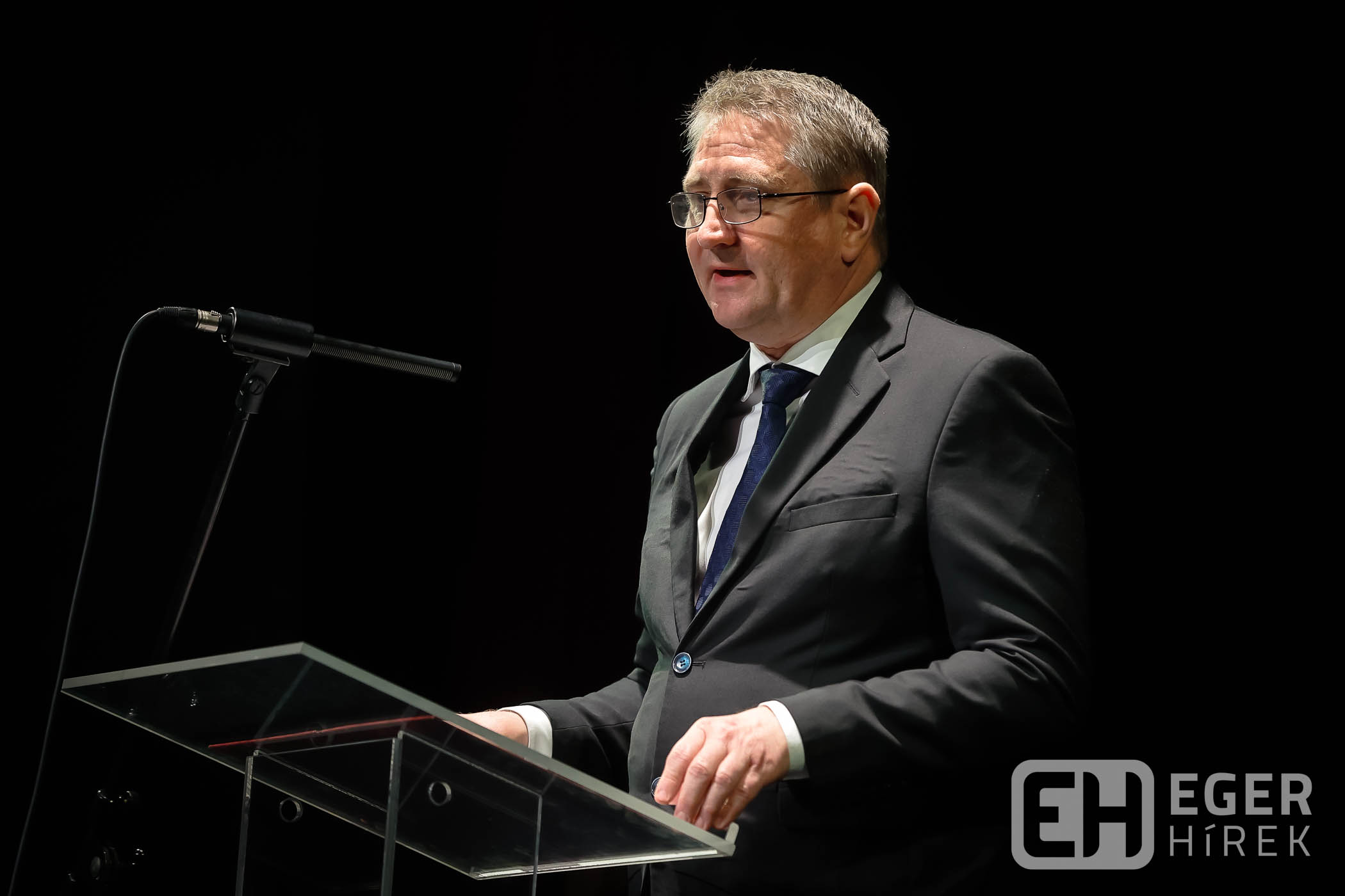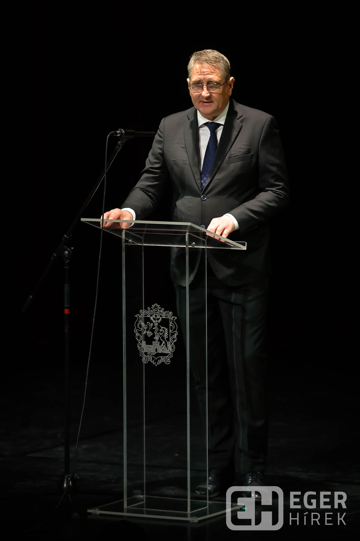 Ezt követően 11 órakor a Gárdonyi Géza Színházban tartották a városi díszünnepséget. Az eseményen a színház művészei adtak ünnepi műsort, majd Vágner Ákos, Eger polgármestere mondott beszédet. A városvezető szavai az ’56-os hősök bátorságát, a nemzeti egység fontosságát és az emlékezés erejét hangsúlyozták.