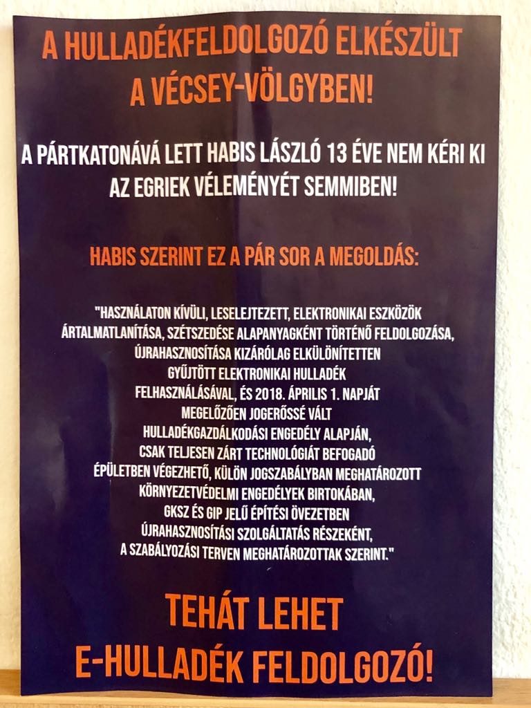 A hulladékfeldolgozó szerintük évekig titokban készült, és nem sül le az arcukról a bőr, hogy eltagadják: a város sosem adott engedélyt ilyen üzem létesítésére. A cég persze próbálkozott próbaüzemmel, beszerzett egy hatósági engedélyt is (az önkormányzattól függetlenül), de az mint midenki tudja, semmire sem elég. Habis László kijelentette, hogy amíg ő a polgármester, ilyen üzem a városban sehol nem létesülhet, és erről döntött is a fideszes többség – az ellenzék pedig nem szavazta meg az üzem tiltását.
