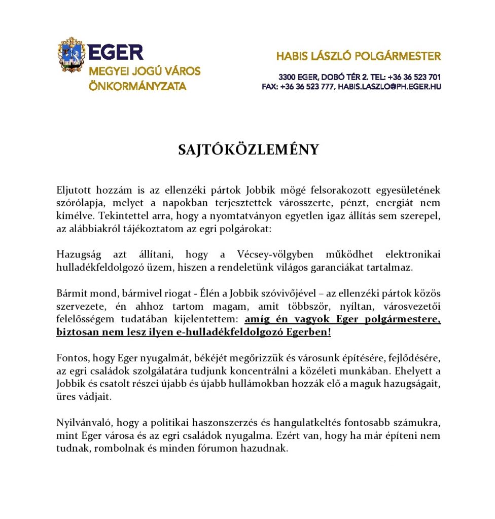 A szerintük Egerbe tervezett hulladéklerakó ügyének napirenden tartása számít a legnagyobb csodafegyvernek. Hiába a számtalan cáfolat és határozat, nem tudnak leállni. Ők csak szórólapoznak rendületlenül és keltik a pánikot a jóérzésű emberekben. Habis László polgármester sokadjára is higgadtan reagált ezekre a vádakra: