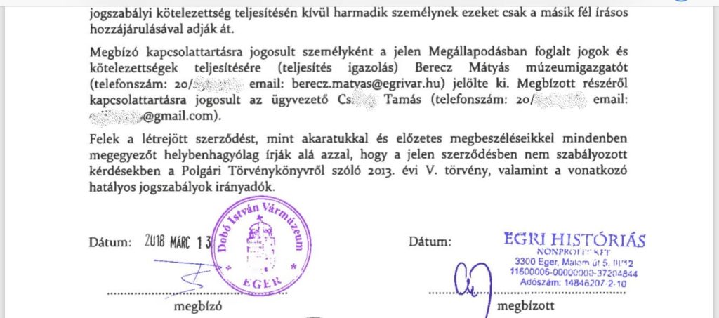 A portálunkhoz közérdekű adatigénylési kérelmünk után eljutott szerződésekből kiderül, hogy gyakorlatilag saját beosztottjával, bizalmi emberével kötött üzletet az igazgató, ugyanis a Históriás Kft. ügyvezetője Cs.Tamás, aki nem mellékesen a Vármúzeum alkalmazásában az Észak-magyarországi Operatív Program (ÉMOP) projektmenedzsereként is tevékenykedett.